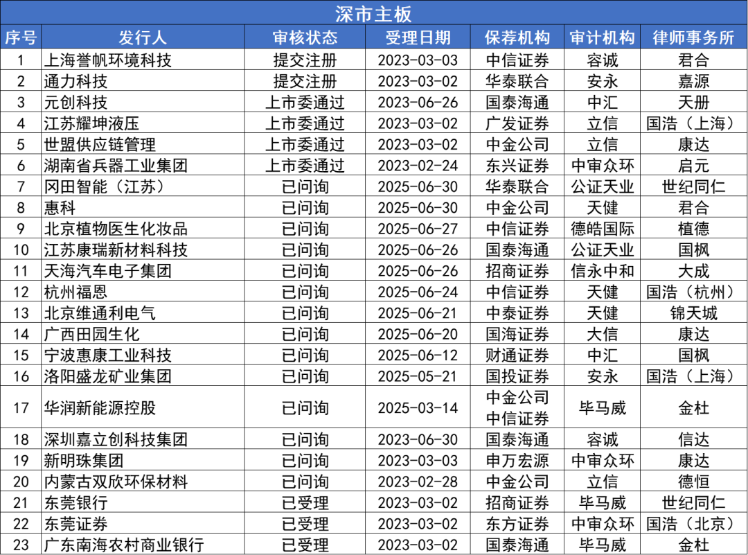 同期,深市主板在審企業(yè)23家,其中,已受理3家,包括東莞銀行、東莞證券、廣東南海農村商業(yè)銀行,均為2023年3月受理;已問詢14家,包括岡田智能(江蘇)、惠科、北京植物醫(yī)生化妝品等;已過會未注冊6家,其中,上市委通過4家,分別為元創(chuàng)科技、江蘇耀坤液壓、、世盟供應鏈管理、湖南省兵器工業(yè)集團;提交注冊2家,分別為上海譽帆環(huán)境科技、通力科技。