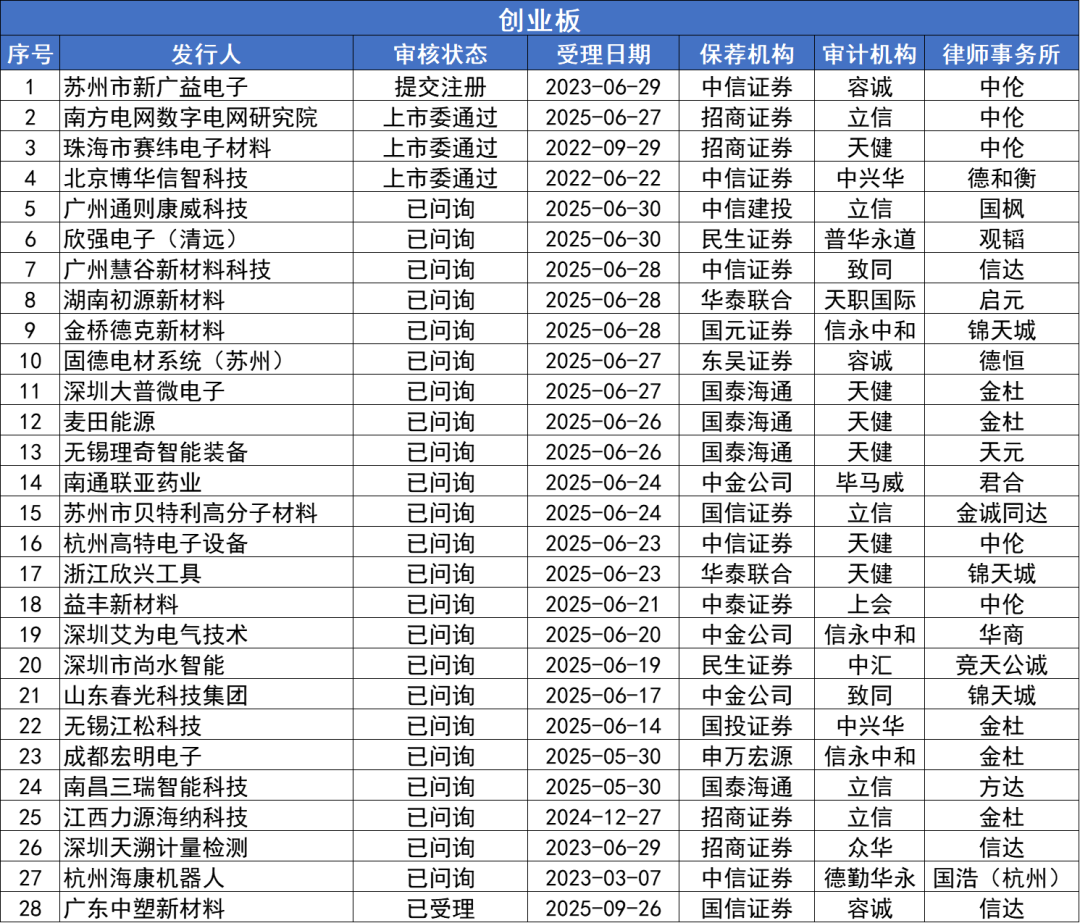同期,創(chuàng)業(yè)板在審企業(yè)28家,有24家企業(yè)已申報未過會,其中,已受理1家,為廣東中塑新材料;已問詢23家,包括廣州通則康威科技、欣強電子(清遠)、廣州慧谷新材料科技、湖南初源新材料等;另有4家已過會未注冊,其中,上市委通過3家,分別為南方電網數(shù)字電網研究院、珠海市賽緯電子材料、北京博華信智科技,提交注冊1家,為蘇州市新廣益電子。