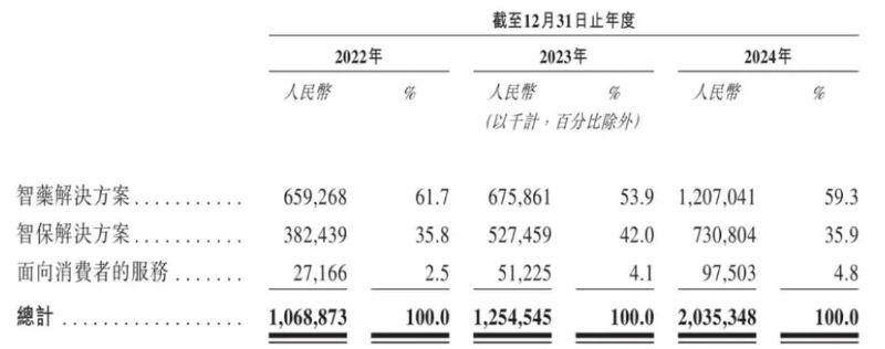 2022年-2024年,鎂信健康的收入分別為10.69億元、12.55億元及20.35億元,其中來自智藥解決方案的收入占比分別為61.7%、53.9%、59.3%。來自智保解決方案的收入占比分別為35.8%、42.0%及35.9%。
