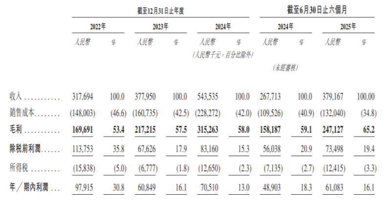 業(yè)績方面,2022年、2023年、2024年及2025年截至6月30日止六個月(報告期內(nèi)),望圓科技實現(xiàn)收入分別約為3.18億元、3.78億元、5.44億元及3.79億元;同期,年內(nèi)/期內(nèi)利潤約為9791.5萬元、6084.9萬元、7051萬元及6108.3萬元。