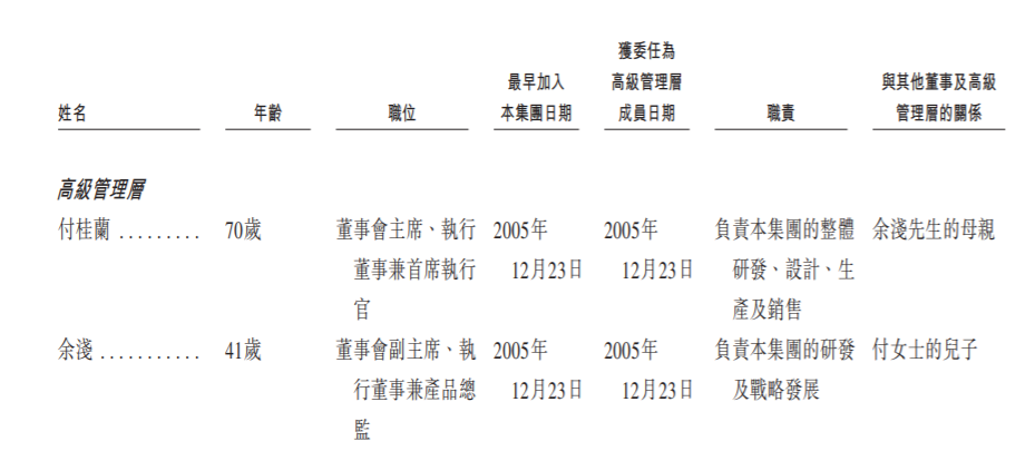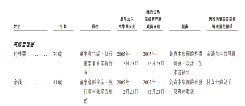 付桂蘭,1955年7月出生,現(xiàn)年70歲,自2005年12月起擔任公司董事會主席,并于2025年9月19日獲調(diào)任為執(zhí)行董事兼首席執(zhí)行官。她主要負責集團的整體研發(fā)、設計、生產(chǎn)及銷售。