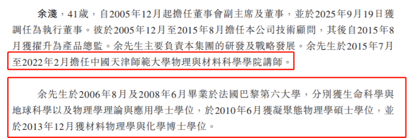 余淺,1984年7月出生,現(xiàn)年41歲,自2005年12月起擔任董事會副主席及董事,并于2025年9月19日獲調(diào)任為執(zhí)行董事。于2005年12月至2015年8月?lián)喂炯夹g顧問,其后自2015年8月獲擢升為產(chǎn)品總監(jiān)。他主要負責集團的研發(fā)及戰(zhàn)略發(fā)展。