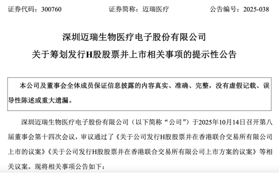 傳出赴港上市消息一個(gè)月后,10月14日晚間,邁瑞醫(yī)療(300760.SZ)以連發(fā)28份相關(guān)公告的方式,正式宣布赴港IPO相關(guān)事宜。