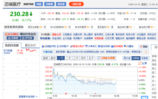 赴港上市靴子落地后,近三個(gè)交易日股價(jià)連續(xù)下跌的邁瑞醫(yī)療10月15日迎來(lái)開(kāi)門(mén)紅,但隨后又波動(dòng)下跌,截至下午14時(shí),邁瑞醫(yī)療報(bào)230.28元/股,跌幅0.17%。總市值2792億元。