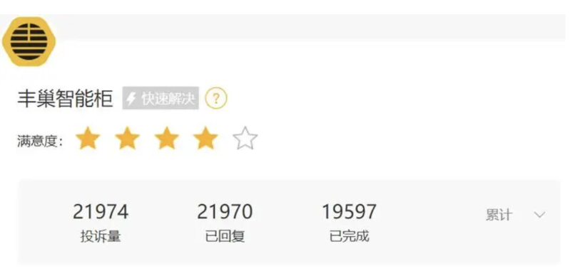 在黑貓投訴平臺(tái)上,有關(guān)“豐巢智能柜”的累計(jì)投訴量,達(dá)到了21974條;近30天,其投訴量為598條。