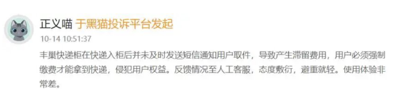 一位網(wǎng)友表示,豐巢快遞柜在快遞入柜后,并未及時(shí)發(fā)送短信通知用戶取件,導(dǎo)致產(chǎn)生滯留費(fèi)用,用戶必須強(qiáng)制繳費(fèi)才能拿到快遞。