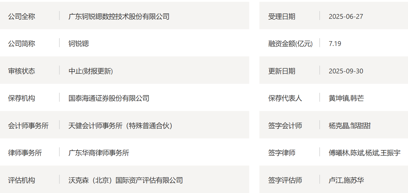 進(jìn)入2025年,不少深圳企業(yè)都瞄準(zhǔn)了資本市場,開始沖刺港股或A股。其中,專注于“工業(yè)母機(jī)”領(lǐng)域的廣東鈳銳鍶數(shù)控技術(shù)股份有限公司(下稱“鈳銳鍶”),于今年6月27日向上交所科創(chuàng)板遞交了IPO申請(qǐng),但因財(cái)報(bào)更新現(xiàn)處于中止審核狀態(tài)。保薦人為國泰海通證券。