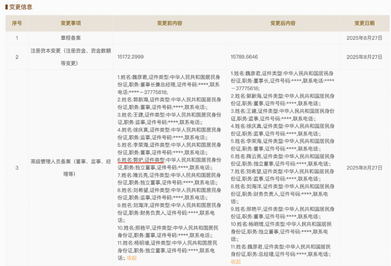 國(guó)家企業(yè)信用信息公示系統(tǒng)顯示,2025年8月,威智醫(yī)藥注冊(cè)資本由約1.52億元增至約1.58億元,增幅為4.07%。此外,獨(dú)立董事郭爐退出。