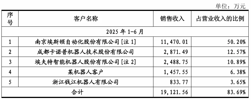 其中對埃斯頓的銷售收入持續(xù)上升,在2022年-2024年及2025年上半年分別達(dá)7289.85萬元、1.6億元、1.98億元和 1.15億元,占各期營收比例分別為43.07%、51.61%、58.14%和50.20%。公司在招股書中明確提示“存在對埃斯頓重大依賴的風(fēng)險”。
