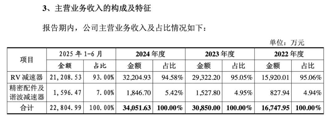 招股書顯示,2022年-2024年及2025年上半年,公司RV減速器收入分別為1.59億元、2.93億元、3.22億元、2.12億元,占主營收比達(dá)95.06%、95.05%、94.58%及93%。相比之下,諧波減速器及其他業(yè)務(wù)收入規(guī)模較小,產(chǎn)品多元化進(jìn)程有待突破。