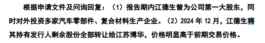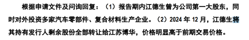 根據(jù)申請文件及問詢回復(fù),報(bào)告期內(nèi)江德生曾為公司第一大股東,同時(shí)對外投資多家汽車零部件、復(fù)合材料生產(chǎn)企業(yè)。