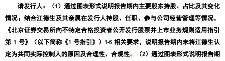北交所請通領(lǐng)科技通過圖表形式說明報(bào)告期內(nèi)主要股東持股、占比及其變化情況;結(jié)合江德生及其親屬在通領(lǐng)科技持股、任職、參與公司經(jīng)營管理等情況,《北京證券交易所向不特定合格投資者公開發(fā)行股票并上市業(yè)務(wù)規(guī)則適用指引第1號》(以下簡稱《1號指引》)1-6相關(guān)要求,說明報(bào)告期內(nèi)未將江德生認(rèn)定為共同實(shí)際控制人的原因及合理性、合規(guī)性。