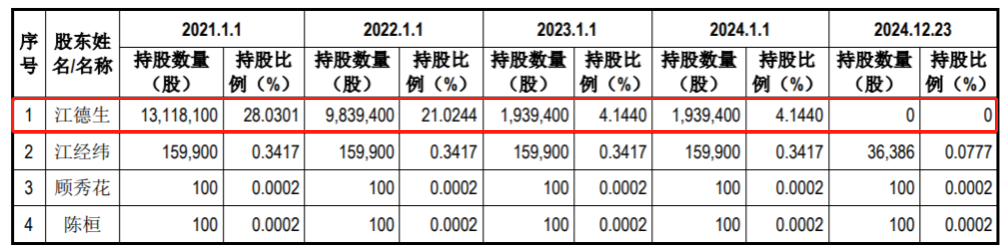 2021年1月1日,江德生之子江經(jīng)緯持有通領(lǐng)科技0.3417%的股份;2022年1月1日,江經(jīng)緯持有通領(lǐng)科技0.3417%的股份;2023年1月1日,江經(jīng)緯持有通領(lǐng)科技0.3417%的股份;2024年1月1日,江經(jīng)緯持有通領(lǐng)科技0.3417%的股份;2024年12月23日至今,江經(jīng)緯持有通領(lǐng)科技0.0777%的股份。