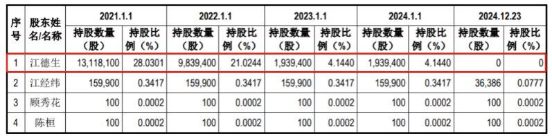 2021年1月1日,江德生持有通領(lǐng)科技28.0301%的股份;2021年12月31日,江德生持有通領(lǐng)科技21.0244%的股份;2021年及2022年,江德生通過大宗交易的方式減持了其持有的大部分股份,2022年12月31日,江德生持有通領(lǐng)科技4.144%的股份;2023年12月31日,江德生持有通領(lǐng)科技4.144%的股份;2024年12月江德生將其持有的全部股份轉(zhuǎn)讓予江蘇博華股權(quán)投資合伙企業(yè)(有限合伙),2024年12月4日至今,江德生不再持有通領(lǐng)科技的任何股份。