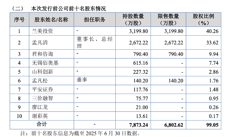 此外,無錫佰奧基持股7.74%,山科創(chuàng)新持股2.86%,孟凡清弟弟孟凡松持股1.76%,平安證券持股1.48%,三價融智持股0.95%。