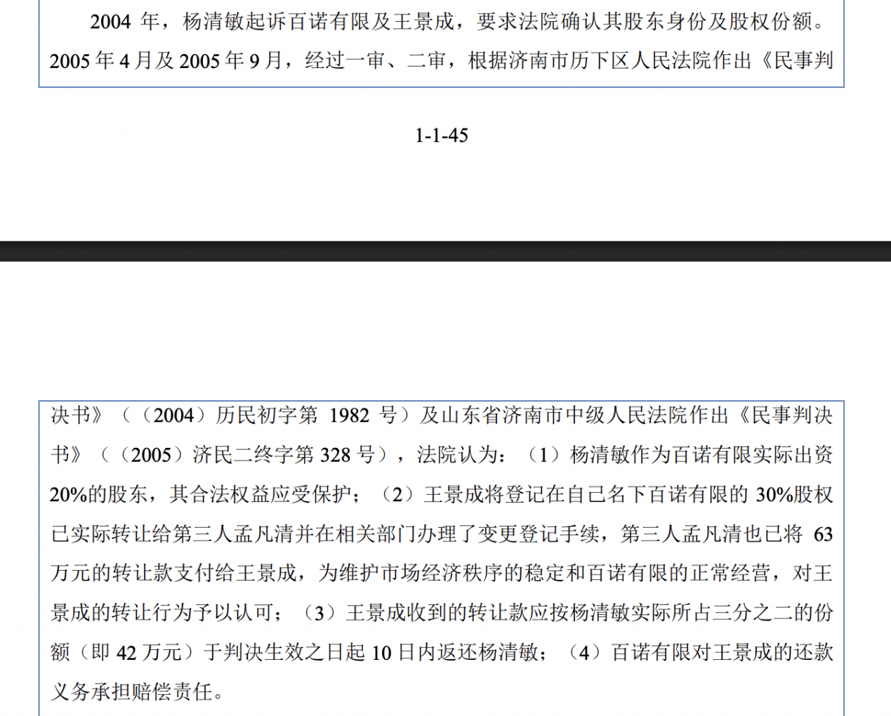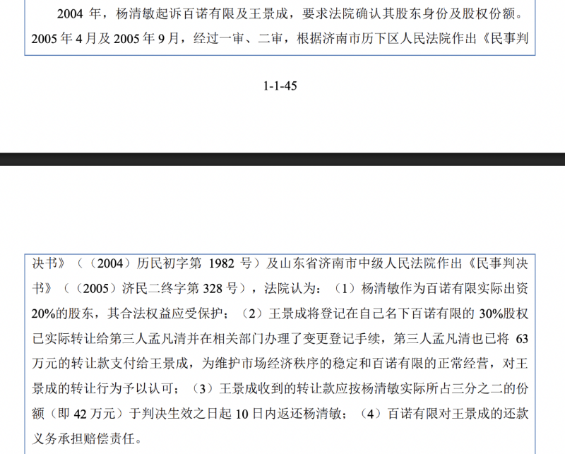 2004年,楊清敏起訴百諾有限及王景成,要求法院確認其股東身份及股權(quán)份額。2005年4月及2005年9月,經(jīng)過一審、二審,根據(jù)濟南市歷下區(qū)人民法院作出《民事判決書》及山東省濟南市中級人民法院作出《民事判決書》,法院認為:楊清敏作為百諾有限實際出資20%的股東,其合法權(quán)益應受保護;王景成將登記在自己名下百諾有限的30%股權(quán)已實際轉(zhuǎn)讓給第三人孟凡清并在相關(guān)部門辦理了變更登記手續(xù),第三人孟凡清也已將63萬元的轉(zhuǎn)讓款支付給王景成,為維護市場經(jīng)濟秩序的穩(wěn)定和百諾有限的正常經(jīng)營,對王景成的轉(zhuǎn)讓行為予以認可;王景成收到的轉(zhuǎn)讓款應按楊清敏實際所占三分之二的份額(即42萬元)于判決生效之日起10日內(nèi)返還楊清敏;百諾有限對王景成的還款義務承擔賠償責任。