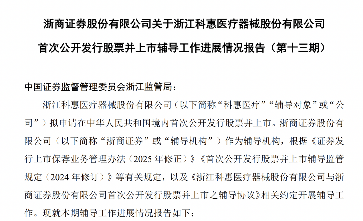 近日,浙江科惠醫(yī)療器械股份有限公司(以下簡(jiǎn)稱(chēng):科惠醫(yī)療)披露首次公開(kāi)發(fā)行股票并上市輔導(dǎo)工作進(jìn)展情況報(bào)告(第十三期),浙商證券為輔導(dǎo)機(jī)構(gòu)。