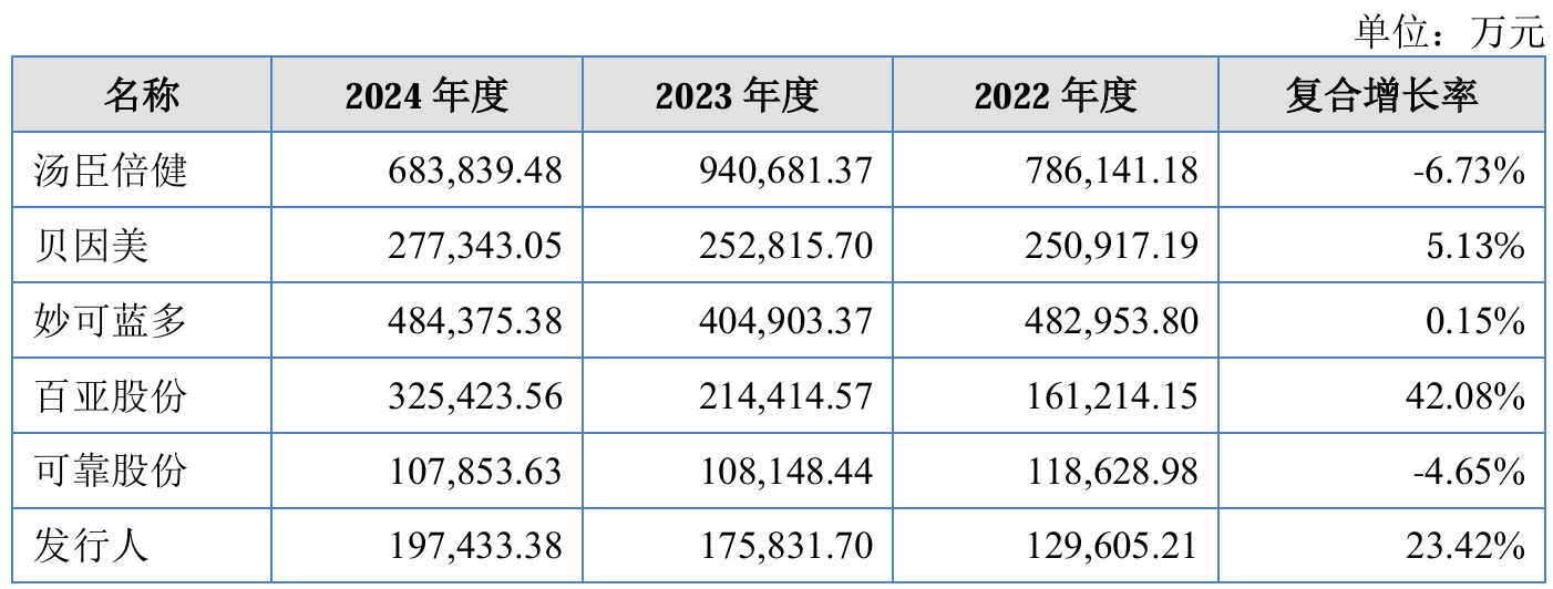 2022年-2024年,英氏控股營(yíng)業(yè)收入分別為12.96億元、17.58億元和19.74億元,年復(fù)合增長(zhǎng)率23.42%,但營(yíng)收規(guī)模與湯臣倍健(300146.SZ)、貝因美(002570.SZ)、妙可藍(lán)多(600882.SH)等同行業(yè)可比,仍存在顯著差距。