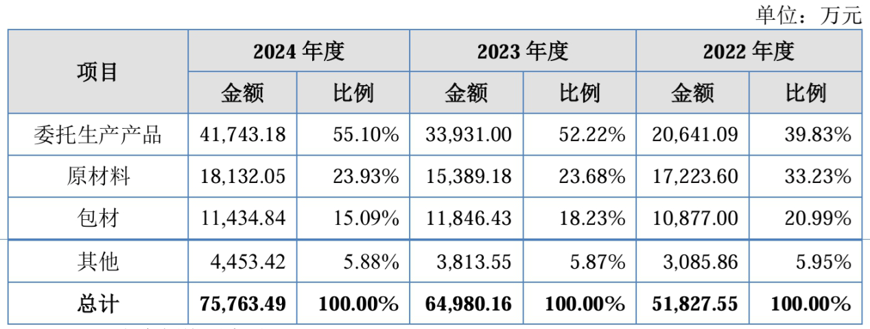 但從數(shù)據(jù)看,2022年-2024年,其直接材料(主要是自主生產(chǎn)所需)占營(yíng)業(yè)成本的比例分別為46.34%、37.01%、32.72%,委托生產(chǎn)成本占比則為37.51%、48.13%、52.62%,即總體上,委托生產(chǎn)仍然是主要的生產(chǎn)方式。
