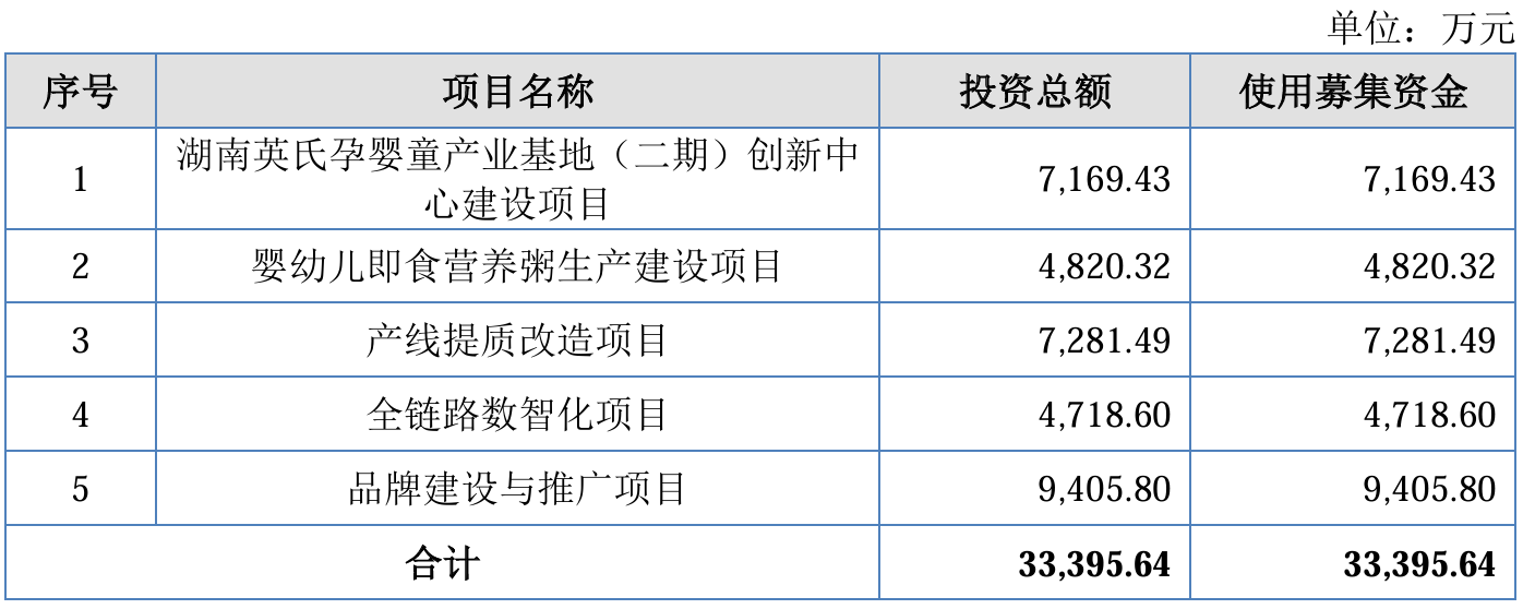 按照計(jì)劃,本次英氏控股轉(zhuǎn)板北交所上市,擬發(fā)行1308.98萬(wàn)股(未考慮超額配售選擇權(quán)),募集資金3.34億元,用于湖南英氏孕嬰童產(chǎn)業(yè)基地(二期)創(chuàng)新中心建設(shè)項(xiàng)目、嬰幼兒即食營(yíng)養(yǎng)粥生產(chǎn)建設(shè)項(xiàng)目、產(chǎn)線提質(zhì)改造項(xiàng)目、全鏈路數(shù)智化項(xiàng)目、品牌建設(shè)推廣等。