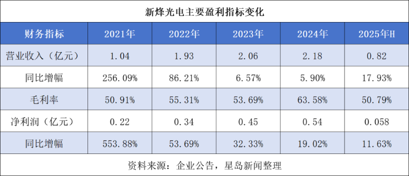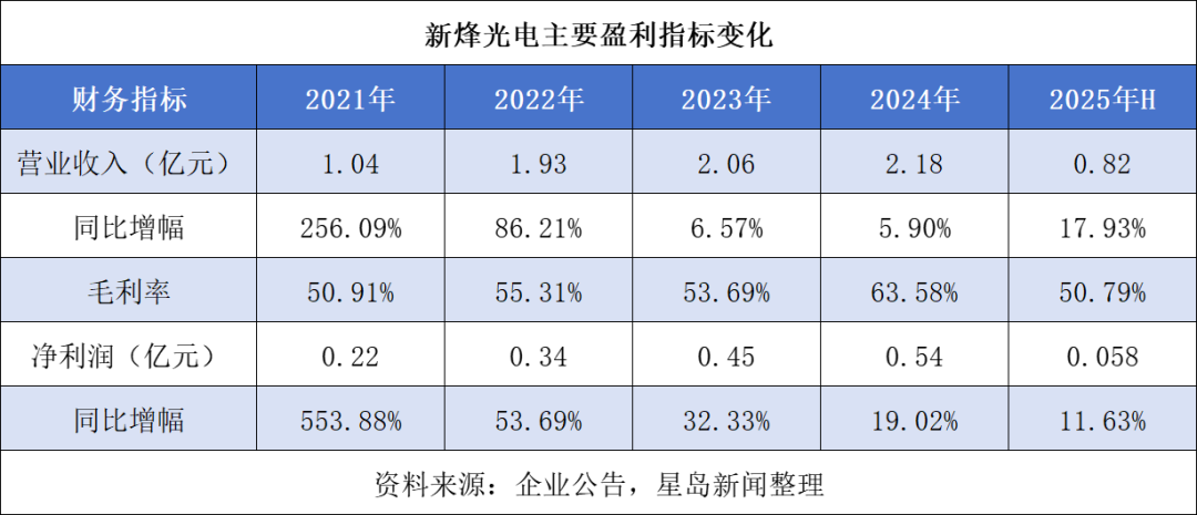 2021年-2024年,新烽光電分別錄得營(yíng)業(yè)收入1.04億元、1.93億元、2.06億元、2.18億元,而隨著規(guī)模增長(zhǎng),增長(zhǎng)幅度出現(xiàn)了逐步放緩跡象。但盡管如此,毛利率方面公司仍維持在50%以上水平,2024年達(dá)到近年新高,為63.58%。