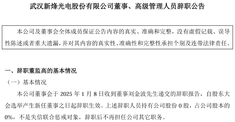 2024年12月31日,新烽光電通過(guò)湖北監(jiān)管局的輔導(dǎo)驗(yàn)收,同日向北交所報(bào)送了IPO的申請(qǐng)材料。怎知,隨即意外出現(xiàn):2025年1月10日,其董事、財(cái)務(wù)負(fù)責(zé)人、董事會(huì)秘書(shū)劉金波因個(gè)人原因辭職。劉金波自2015年起擔(dān)任公司財(cái)務(wù)總監(jiān),其在公司推進(jìn)IPO的關(guān)鍵期突然離職,引發(fā)了市場(chǎng)對(duì)內(nèi)部治理穩(wěn)定性的疑慮,亦開(kāi)始擔(dān)憂新烽光電審核風(fēng)險(xiǎn)陡升。