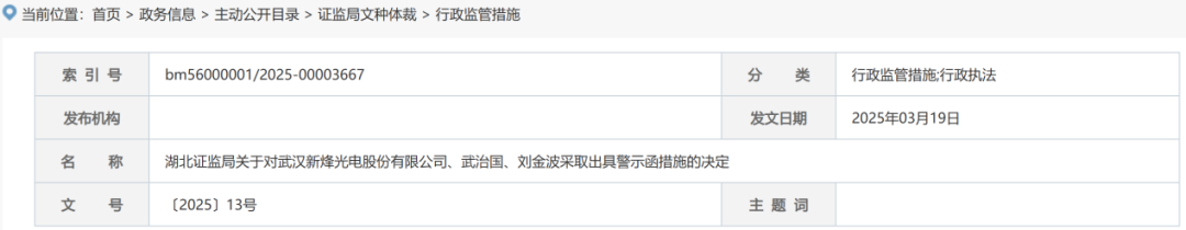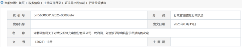 2025年3月19日,湖北證監(jiān)局對(duì)新烽光電、實(shí)控人武治國(guó)、劉金波采取出具警示函措施,其中劉金波被涉及的主要是2023年半年度報(bào)告錯(cuò)報(bào)一事。