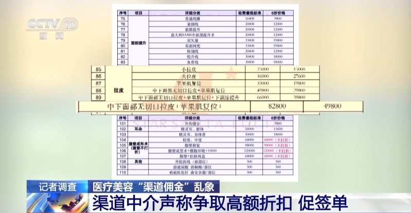 這位渠道經(jīng)理還向記者提供了一份內(nèi)部報(bào)價(jià)表,記者注意到,表格中的每個(gè)項(xiàng)目都有兩種價(jià)格。例如,針對(duì)“中下面部無切口拉皮加蘋果肌復(fù)位”這一項(xiàng)目,其“收費(fèi)最低標(biāo)準(zhǔn)”為82800元,而另外一種“六折價(jià)格”則為49800元。