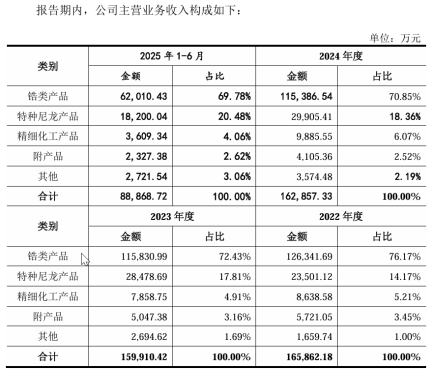 對(duì)于2023年主營(yíng)業(yè)務(wù)收入下滑,長(zhǎng)裕集團(tuán)在招股書(shū)中的解釋是,主要受鋯英砂及其他主要原材料市場(chǎng)價(jià)格下降影響,公司鋯類產(chǎn)品銷售單價(jià)及銷售收入下降。鋯類產(chǎn)品是公司核心業(yè)務(wù),亦是營(yíng)收第一主力。2022年-2024年及2025年上半年,該項(xiàng)收入占比分別為76.17%、72.43%、70.85%及69.78%。