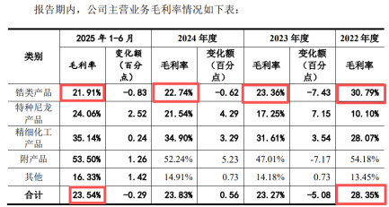 具體來(lái)看,鋯類產(chǎn)品在2022年時(shí)毛利率為30.79%,2023年下滑至23.36%,到今年上半年已經(jīng)降至21.91%。