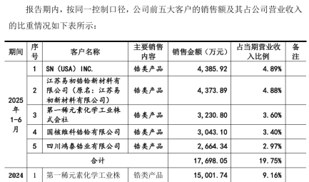 第一稀元素是長(zhǎng)裕集團(tuán)孫公司的參股股東,今年上半年已退居第三大客戶,營(yíng)收占比從2024年的9.16%降至3.60%,但即便如此,問(wèn)詢函中仍就雙方關(guān)系提出了如設(shè)立合資公司的背景及原因,是否為合作投資協(xié)議約定銷售等10個(gè)問(wèn)題。