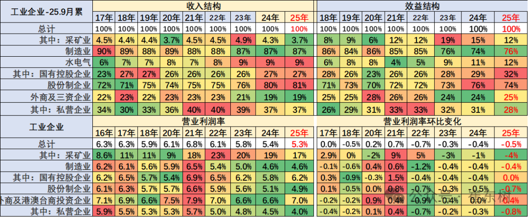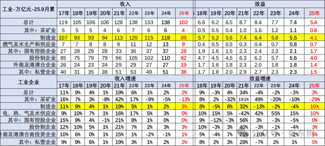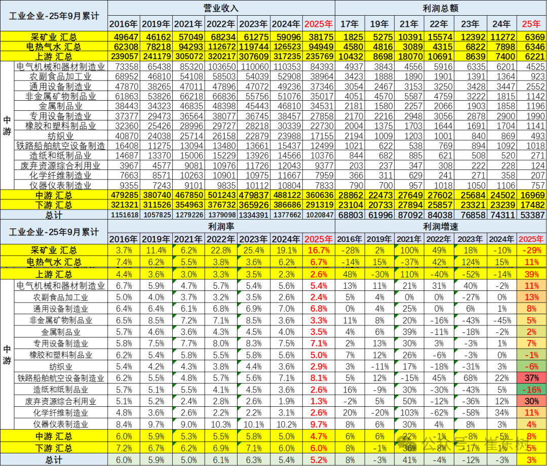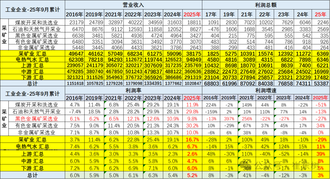 2025年1-9月的高基數(shù)和價格走低下,采礦利潤下降29%仍有很好利潤,采礦業(yè)1-9月利潤率在16.7%水平也是很好的。