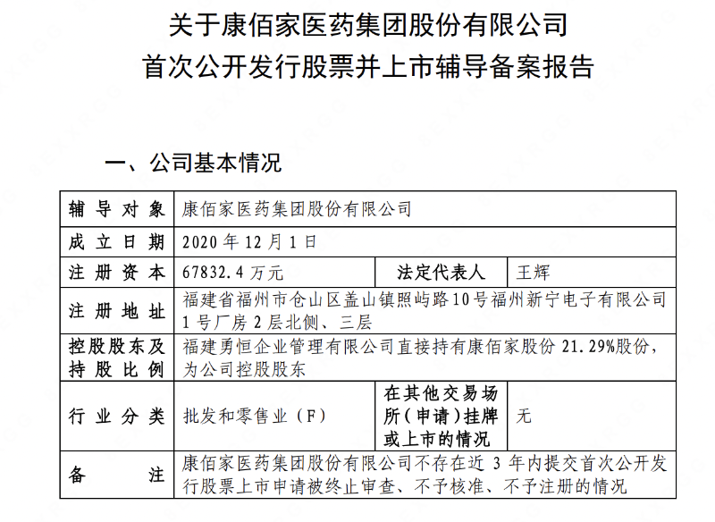 10月24日,康佰家醫(yī)藥集團(tuán)股份有限公司(以下簡稱:康佰家)在福建證監(jiān)局完成IPO輔導(dǎo)備案,輔導(dǎo)券商為中信證券,律師事務(wù)所為湖南啟元,會(huì)計(jì)師事務(wù)所為天健。