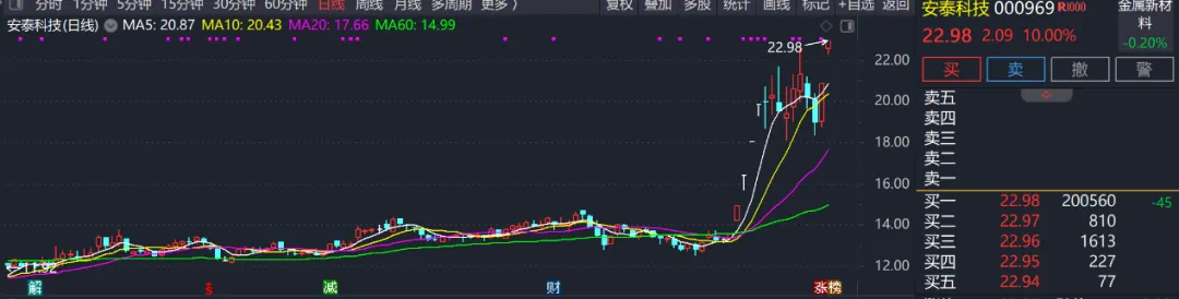 10月28日,安泰科技股份有限公司(以下簡稱“安泰科技”,000969.SZ)達(dá)成兩連板,收報(bào)22.98元,漲幅10%,總市值達(dá)241.5億元。全天換手率9.72%,成交額22.92億元,振幅3.05%。