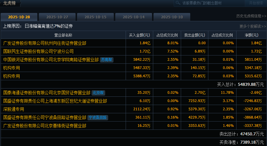 10月28日,發(fā)布的前五大買賣數(shù)據(jù)中,深股通專用席位買入2112.24萬元并賣出5379.30萬元。其中,2家機(jī)構(gòu)專用席位凈買入1.07億元。此外,買一、買二、買三分別為廣發(fā)證券有限公司杭州向往街證券營業(yè)部、國聯(lián)民生證券有限公司寧波分公司、中國銀河證券有限公司北京學(xué)院南路證券營業(yè)部。凈買入合計(jì)達(dá)7389.18萬元。