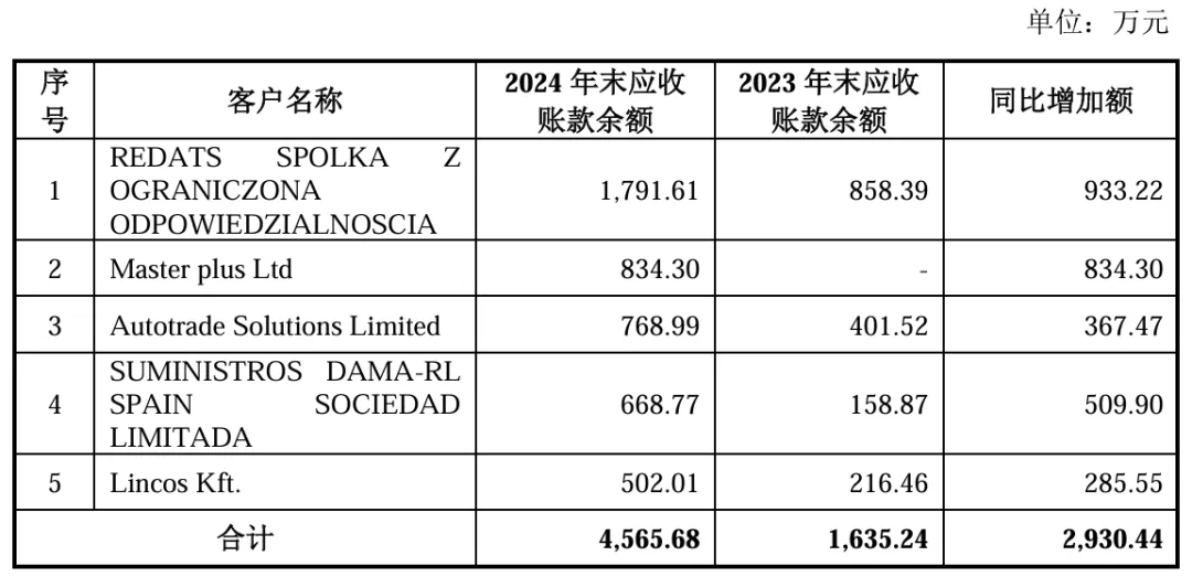對于2024年應收賬款大幅增加,巴蘭仕解釋,主要原因系期內(nèi)銷售收入大幅增加,信用期內(nèi)應收賬款大幅增加所致。其中,應收賬款大幅增加的前五名客戶均是境外企業(yè),截至2025年2月28日,僅對一名客戶實現(xiàn)100%回款,剩余四名客戶回款比例最低只有56.19%。