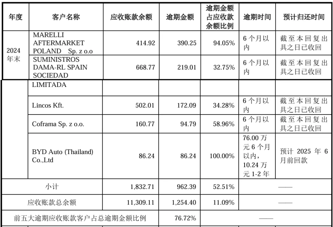 不僅如此,2022-2024年,巴蘭仕的逾期應收賬款金額分別為730.34萬元、360.55萬元、1254.40萬元,占應收賬款余額比例分別為14.59%、6.28%和11.09%。而其中,前五大逾期應收賬款客戶基本也來自國外,以2024年底為例,排名第一的是MARELLI AFTERMARKET POLAND Sp.zo.o,逾期金額390.25萬元,占對應應收賬款余額比例的94.05%,直到2025年上半年才收回。