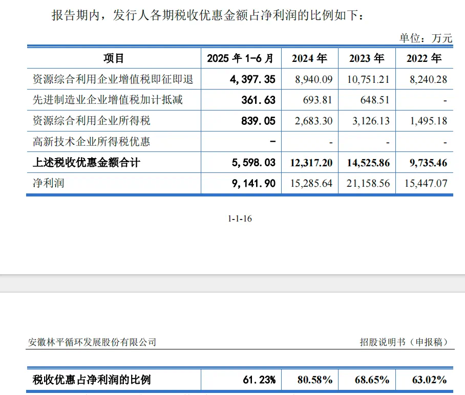 據(jù)其招股說明書,2022年-2025年上半年,林平發(fā)展所得稅優(yōu)惠金額分別為9735.46萬元、1.45億元、1.23億元以及5598.03萬元,占凈利潤的比例分別為63.02%、68.65%、80.58%以及61.23%。這意味著2022年和2023年公司超六成的凈利潤來自稅收優(yōu)惠,2024年更是超過八成。