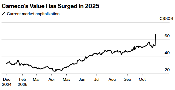 智通財(cái)經(jīng)APP獲悉,周二,全球最大鈾燃料供應(yīng)商之一、加拿大鈾礦公司Cameco(CCJ.US)市值上漲逾 120 億加元(約合 87 億美元),其股價(jià)創(chuàng)下歷史新高,原因是該公司旗下西屋電氣宣布與美國(guó)政府達(dá)成協(xié)議,將建造至少價(jià)值 800 億美元的新核反應(yīng)堆。該股票在周二美股收盤時(shí)上漲超過 23%,而今年截至目前其漲幅已超過 100%。