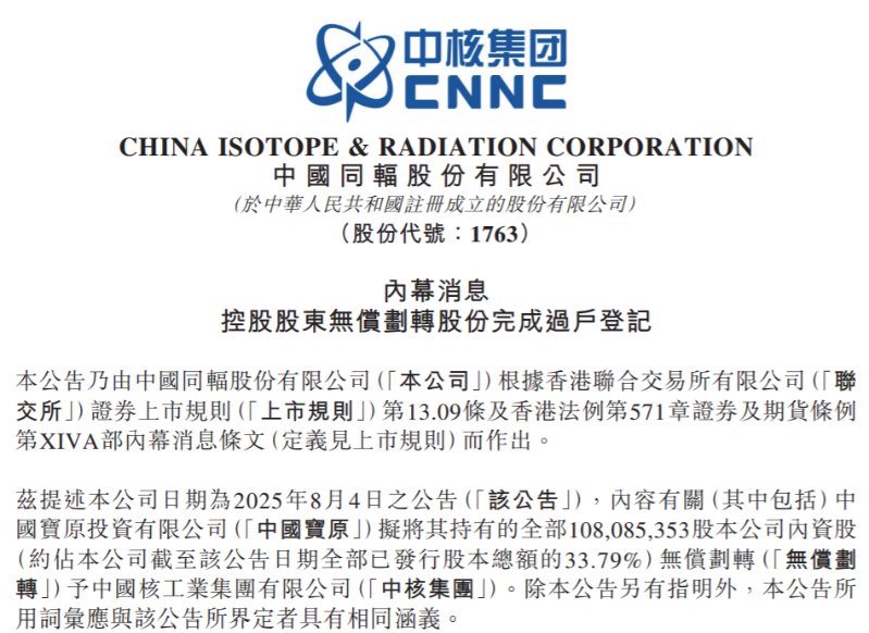 今年8月,中國(guó)同輻發(fā)布公告,中國(guó)寶原投資有限公司(以下簡(jiǎn)稱“中國(guó)寶原”)持有的10808.5353萬(wàn)股內(nèi)資股被無(wú)償劃轉(zhuǎn)至中核集團(tuán),此次劃轉(zhuǎn)股份數(shù)量占公司總股本的33.79%。
