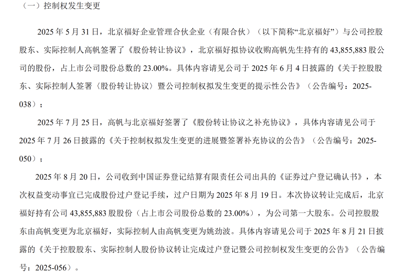 2025年5月31日,北京福好企業(yè)管理合伙企業(yè)(有限合伙)(以下簡(jiǎn)稱“北京福好”)與公司控股股東、實(shí)際控制人高帆簽署了《股份轉(zhuǎn)讓協(xié)議》,北京福好擬協(xié)議收購(gòu)高帆持有的4385.59萬(wàn)股公司的股份,占上市公司股份總數(shù)的23%。