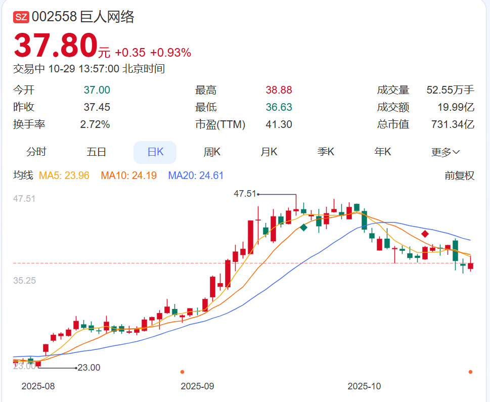 10月29日,巨人網(wǎng)絡(luò)股價上漲,截至發(fā)稿報37.8元,年初至今已漲超200%,總市值731.34億元。
