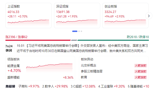 10月29日消息,指數(shù)走強(qiáng),滬指再創(chuàng)階段新高,北證50漲超8%。截至收盤,滬指報(bào)4016.33點(diǎn),漲0.70%;深成指報(bào)13691.38點(diǎn),漲1.95%;創(chuàng)指報(bào)3324.27點(diǎn),漲2.93%。