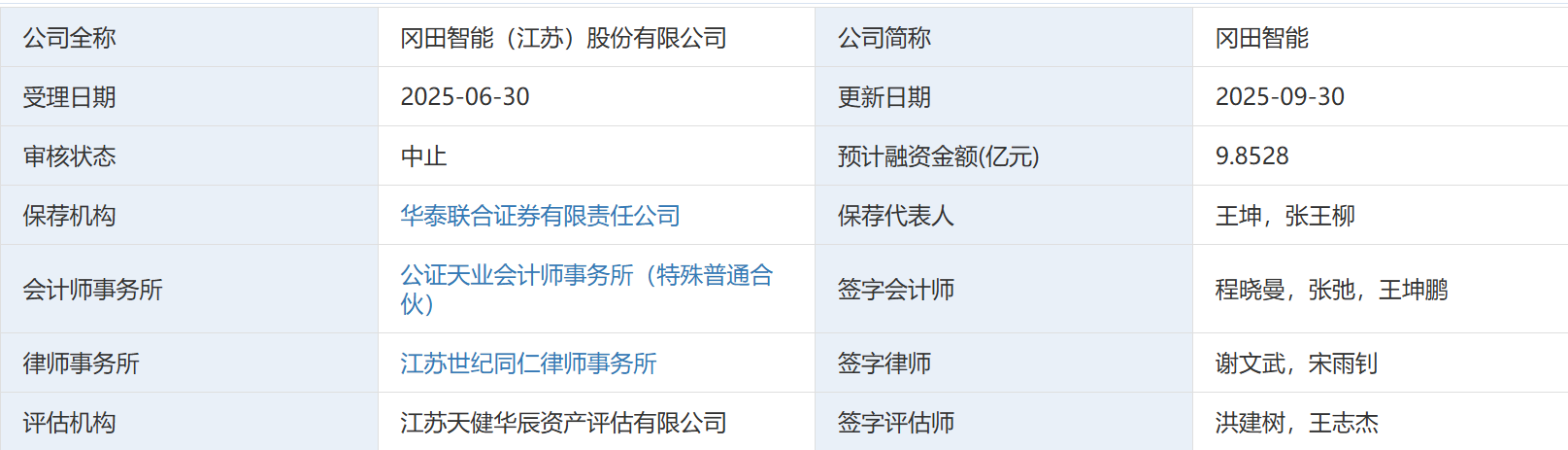 深交所發(fā)行上市審核信息顯示,截至2025年9月30日,岡田智能(江蘇)股份有限公司(下稱“岡田智能”)的審核狀態(tài)已由“已問詢”變更為“中止”,原因是財務資料已過有效期,需補充提交。
