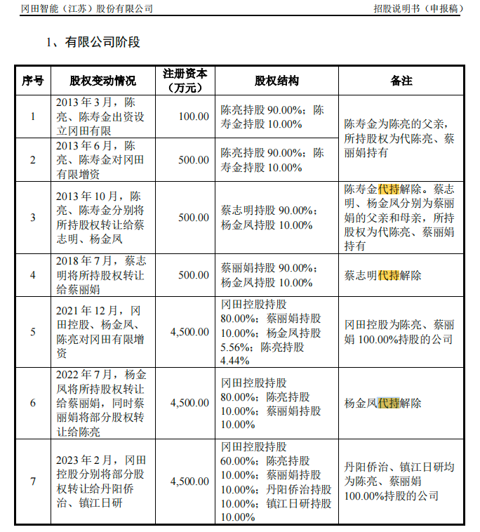 招股書顯示,回溯至2013年3月,陳亮與其父親陳壽金共同出資設立了岡田有限,陳亮持股90%,陳壽金持股 10% ,但陳壽金所持股權(quán)為代陳、蔡夫婦持有。同年10月,陳壽金將所持股權(quán)轉(zhuǎn)讓給了楊金鳳(蔡麗娟母親),解除代持,陳亮又將其所持有的全部股權(quán)轉(zhuǎn)讓給了蔡志明(蔡麗娟父親),至此,變成蔡麗娟的父母代持陳亮與蔡麗娟股權(quán),且直至2018年和2022年,這兩筆代持才相繼解除。