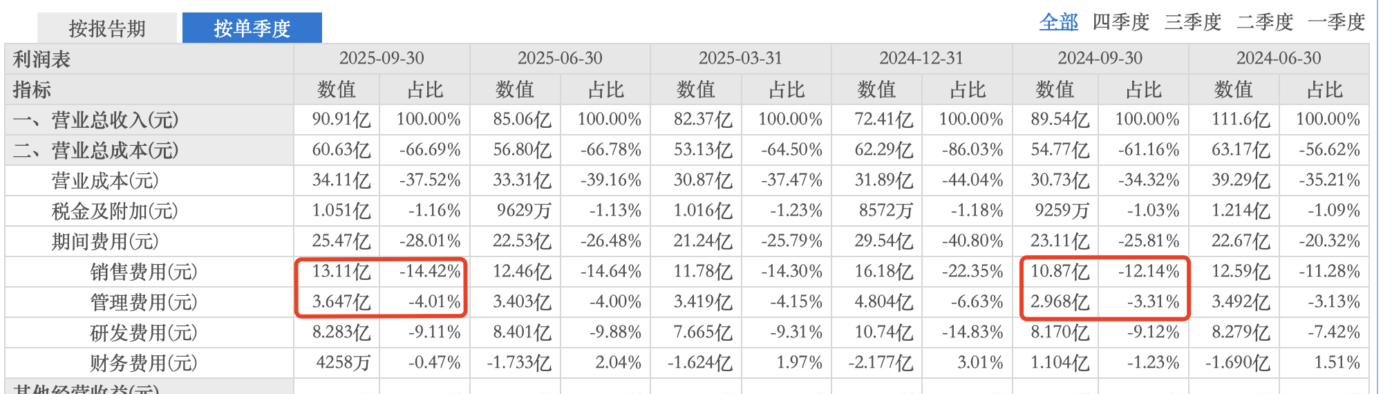 其中銷售費(fèi)用從2024年第三季度的10.87億元增長(zhǎng)至13.11億元,同比增幅達(dá)20.61%;管理費(fèi)用從2.97億元增加到了3.65億元,同比增幅22.9%,遠(yuǎn)超同期的收入增幅。