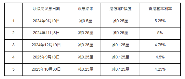 相隔9個月,美國聯(lián)儲局在今年9月重啟減息,宣布減息0.25厘,將聯(lián)邦基金利率目標區(qū)間下調至4.0厘至4.25厘,香港銀行再度下調P息0.125厘,為第4度減P。
