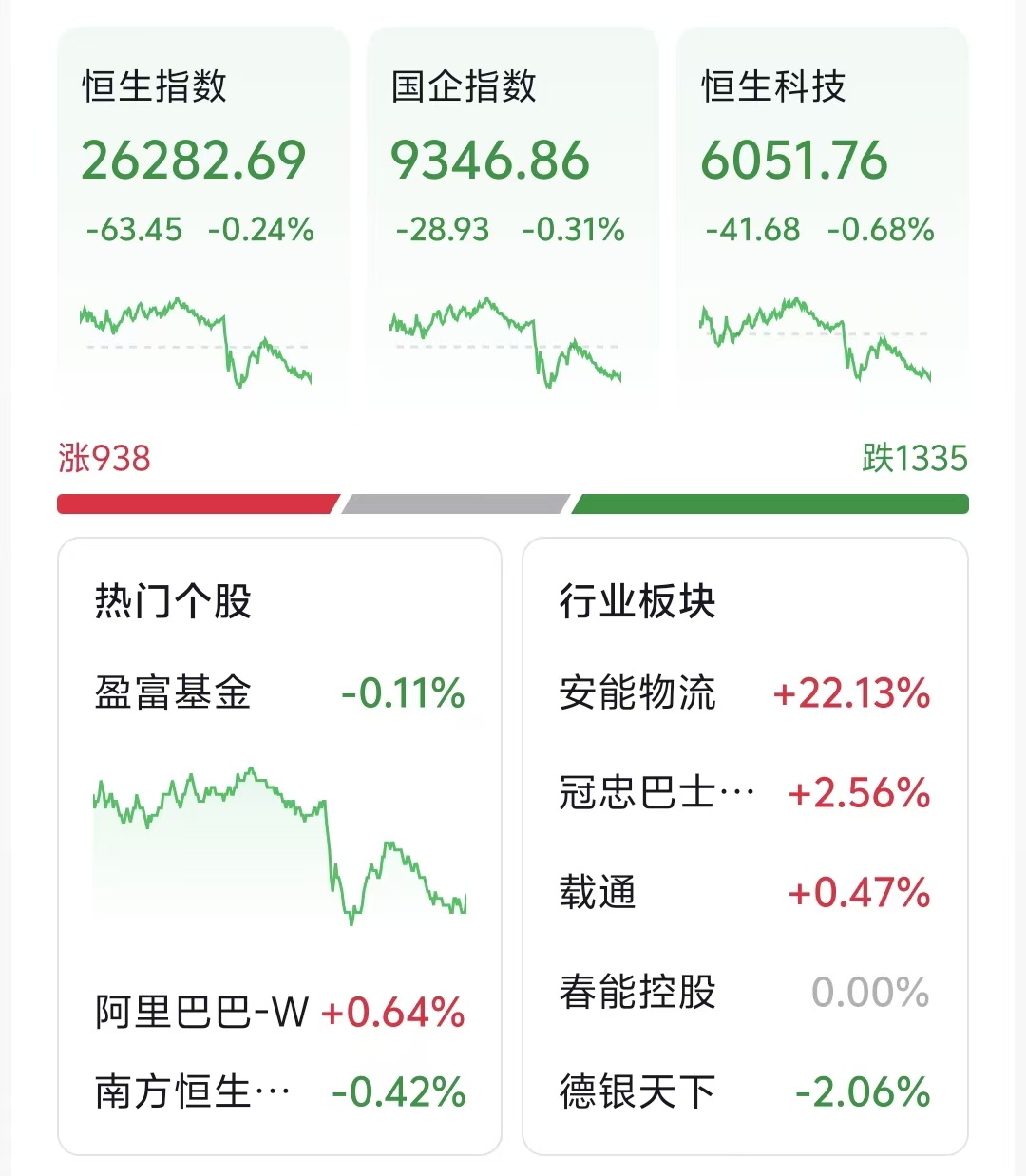 10月30日消息,港股三大指數(shù)高開低走。截至收盤,恒生指數(shù)(26286.15, -59.99, -0.23%)跌0.24%,報(bào)26282.69點(diǎn),恒生科技指數(shù)(6052.19, -41.25, -0.68%)跌0.68%,國(guó)企指數(shù)跌0.31%。