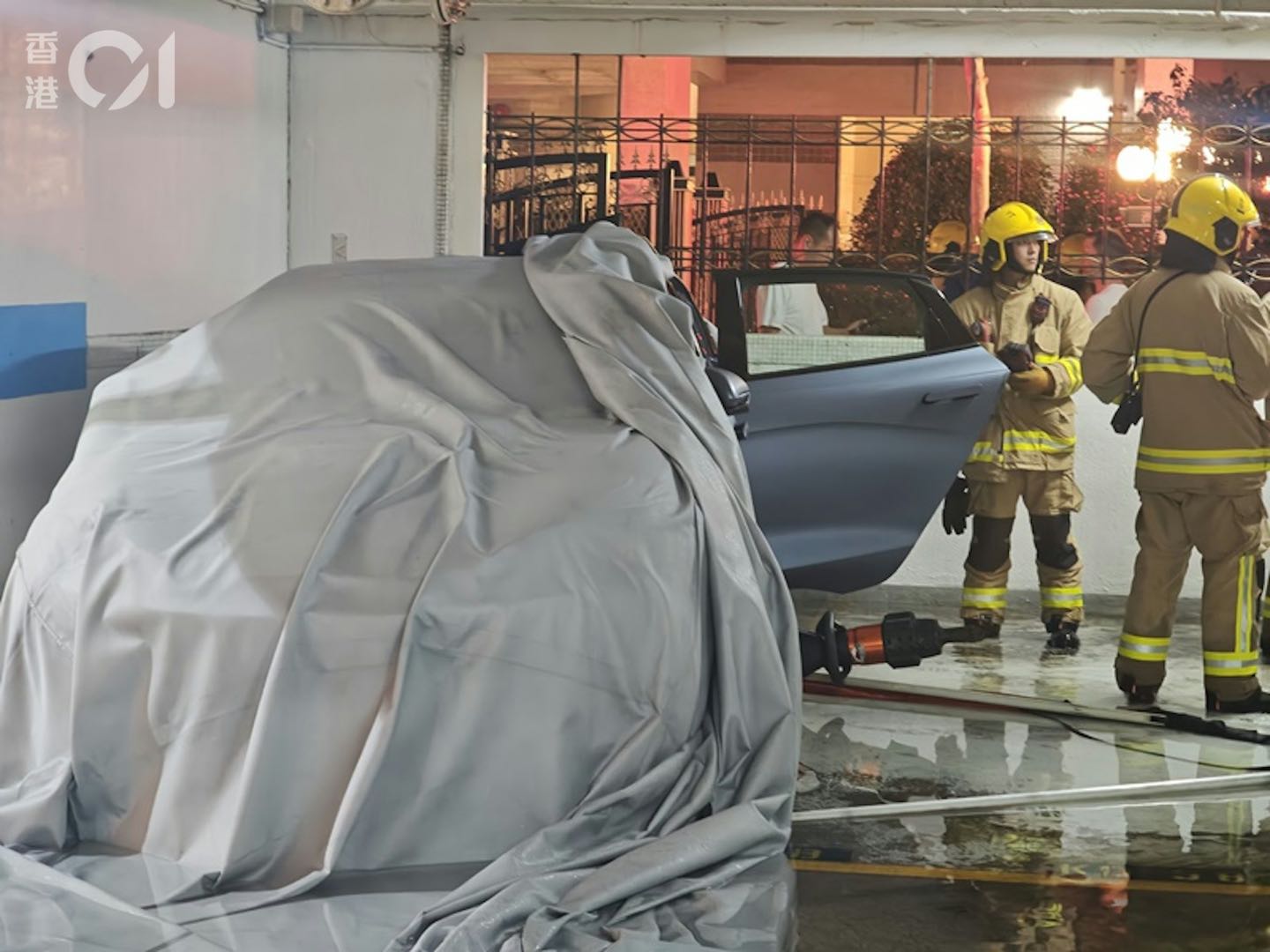 ▲消防員在用“電動車輛滅火氈”覆蓋涉事車輛。圖源:香港01