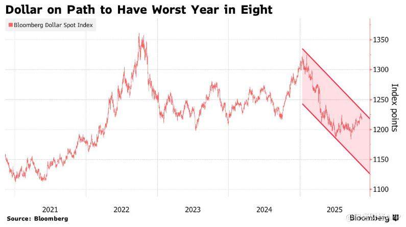 Jen以其提出的“美元微笑理論”(Dollar Smile Theory)而聞名,他預(yù)測(cè),在特朗普總統(tǒng)任期的剩余時(shí)間里,美元指數(shù)還將下跌約13.5%。這意味著在2025年已累計(jì)下跌約7%的基礎(chǔ)上,美元或?qū)⒂瓉?lái)八年來(lái)最糟糕的一年。